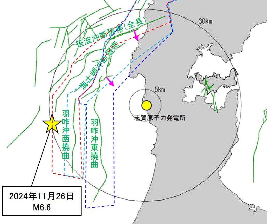 13:30 はじめに ○当社は,第1328回審査会合(2025年3月21日)において,2024年1月1日に発生した令和6年能登半島地震(M7.6)及び2024年11月26日に発生した石川県西方沖の地震(M6.6)の知見を踏まえた敷地周辺(海域)の断層の評価について説明を行い,以下@〜Cの4項目に関するコメントを受けた。 @ 石川県西方沖の地震(M6.6)の震源断層(コメントNo.81) A 石川県西方沖の地震(M6.6)の震源断層との連動(コメントNo.82) B 能登半島北部沿岸域断層帯等の傾斜角の評価(コメントNo.83) C 連動評価フローにおける表現の適正化(コメントNo.84) ○本日は,上記コメントのうち,@及びAについて第1328回審査会合以降に確認した知見を踏まえて,回答を行う。Bについては,その他の敷地周辺(海域)の断層の評価も含めて次回以降回答予定。Cについては,第1371回審査会合(2025年11月21日)で回答済。 ○また,第1371回審査会合(2025年11月21日)で説明を行った「敷地周辺(陸域)の断層の評価」において,陸域の断層に関するコメントのほか,一部海域の断層にも関連するD敷地周辺断層の評価の流れ(コメントNo.85)についてのコメントを受けたことから,このコメントへの回答も行う。 ○ なお,当資料の冒頭(P.8〜22)において,今回とりまとめた資料の概要を以下の項目ごとに整理した。 T.令和6年能登半島地震の概要 U.令和6年能登半島地震に関連する知見の収集状況 V.コメント回答の概要※ W.敷地周辺断層の評価の流れ X.敷地周辺断層の評価結果(まとめ) ※:今回連動を考慮した 「笹波沖断層帯(全長)と羽咋沖西撓曲」と同様に,傾斜方向が異なる断層が一部並走区間を伴って近接して分布する関係にある「海士岬沖断層帯と羽咋沖東撓曲」の連動評価についても,改めて検討を実施。 【本日の説明内容】 ![]() ・@ 石川県西方沖の地震(M6.6)の震源断層 (コメントNo.81)(図中 ☆ ) ・A 石川県西方沖の地震(M6.6)の震源断層との連動 (コメントNo.82)(図中 赤・青・緑色点線の四角枠) ・D 敷地周辺断層の評価の流れ (コメントNo.85) 【次回以降説明予定】 ・B 能登半島北部沿岸域断層帯等の傾斜角の評価 (コメントNo.83)(図中 赤色右下向き矢印) 【説明済(第1371回審査会合(2025年11月21日))】 ・C 連動評価フローにおける表現の適正化 (コメントNo.84 原発30km圏内の拡大図(※引用者作成) ![]() (後略) |