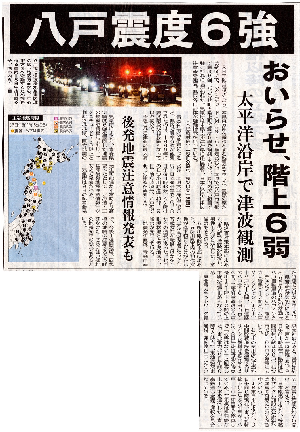 | ============================= 東奥日報第1報 ============================= (1) 東奥 12/9 八戸震度6強 おいらせ 階上6弱 太平洋沿岸で津波観測 後発地震注意情報発表も |