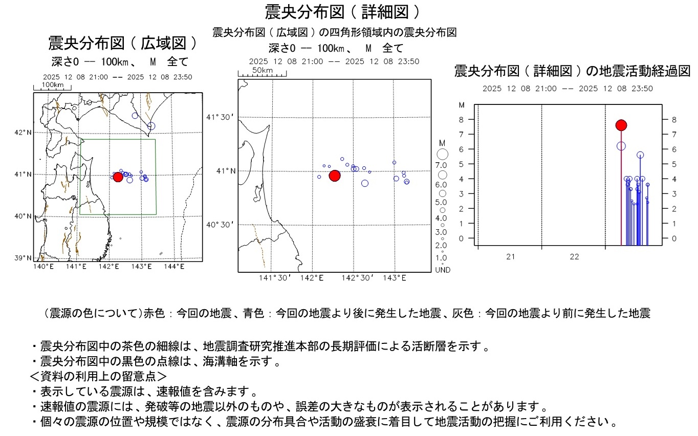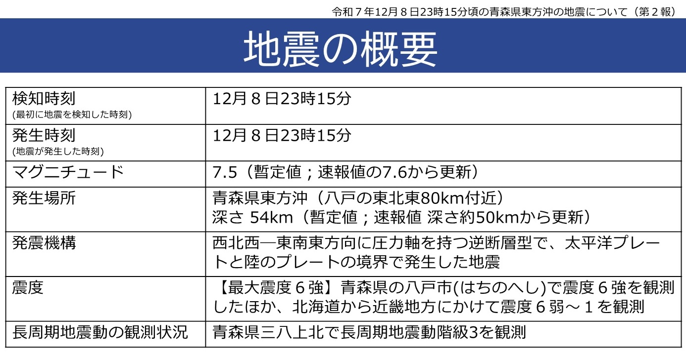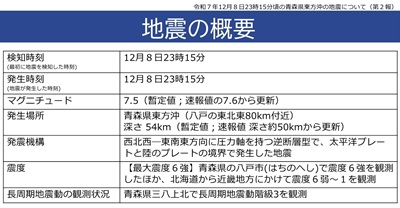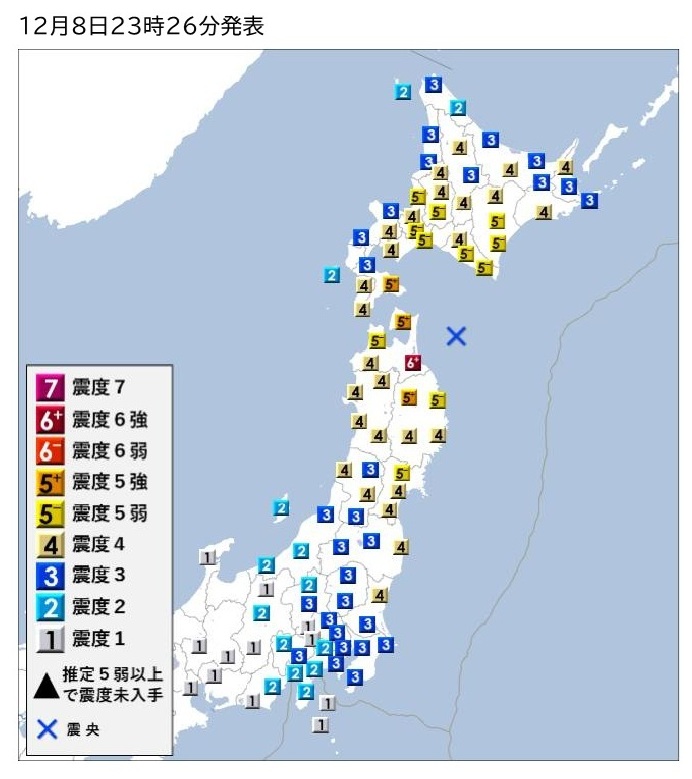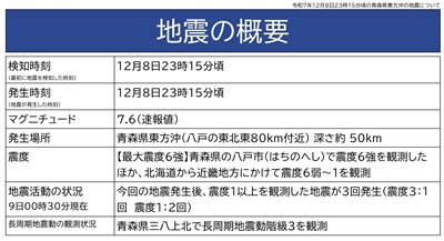 8日午後11時15分ごろ、青森県沖を震源とする震度6強の地震があり、気象庁は9日午前2時、日本海溝・千島海溝沿いで大規模地震の発生可能性が平常時より相対的に高まったとして「北海道・三陸沖後発地震注意情報」を発表した。発表は、2022年12月の制度運用開始後初めて。