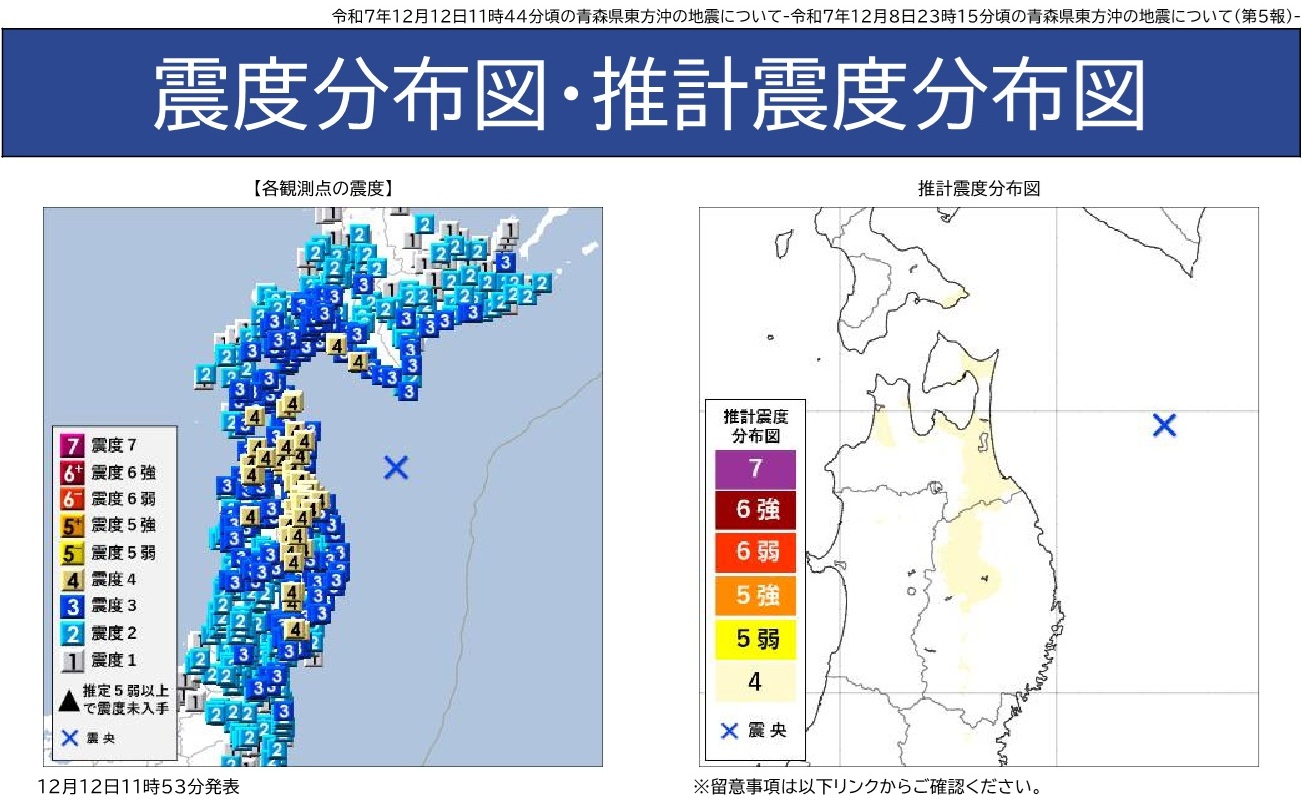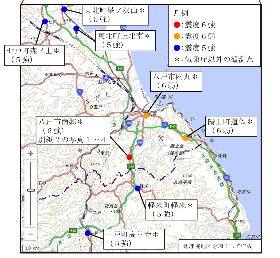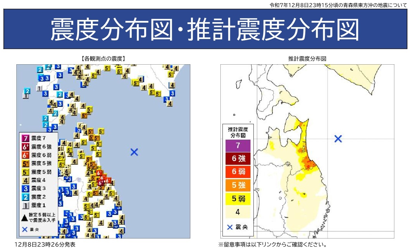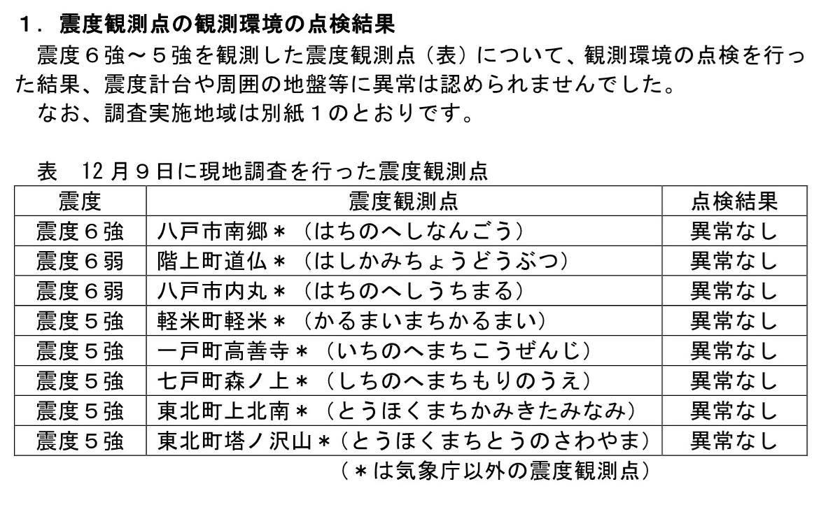 令和7年12月8日23時15分に青森県東方沖で発生した地震について、青森地方気象台と盛岡地方気象台は、昨日(12月9日)、「気象庁機動調査班(JMA-MOT※)」を派遣し、青森県、岩手県内で震度6強〜5強を観測した震度観測点の観測環境や震度観測点周辺の被害状況を把握するため現地調査を実施しました。