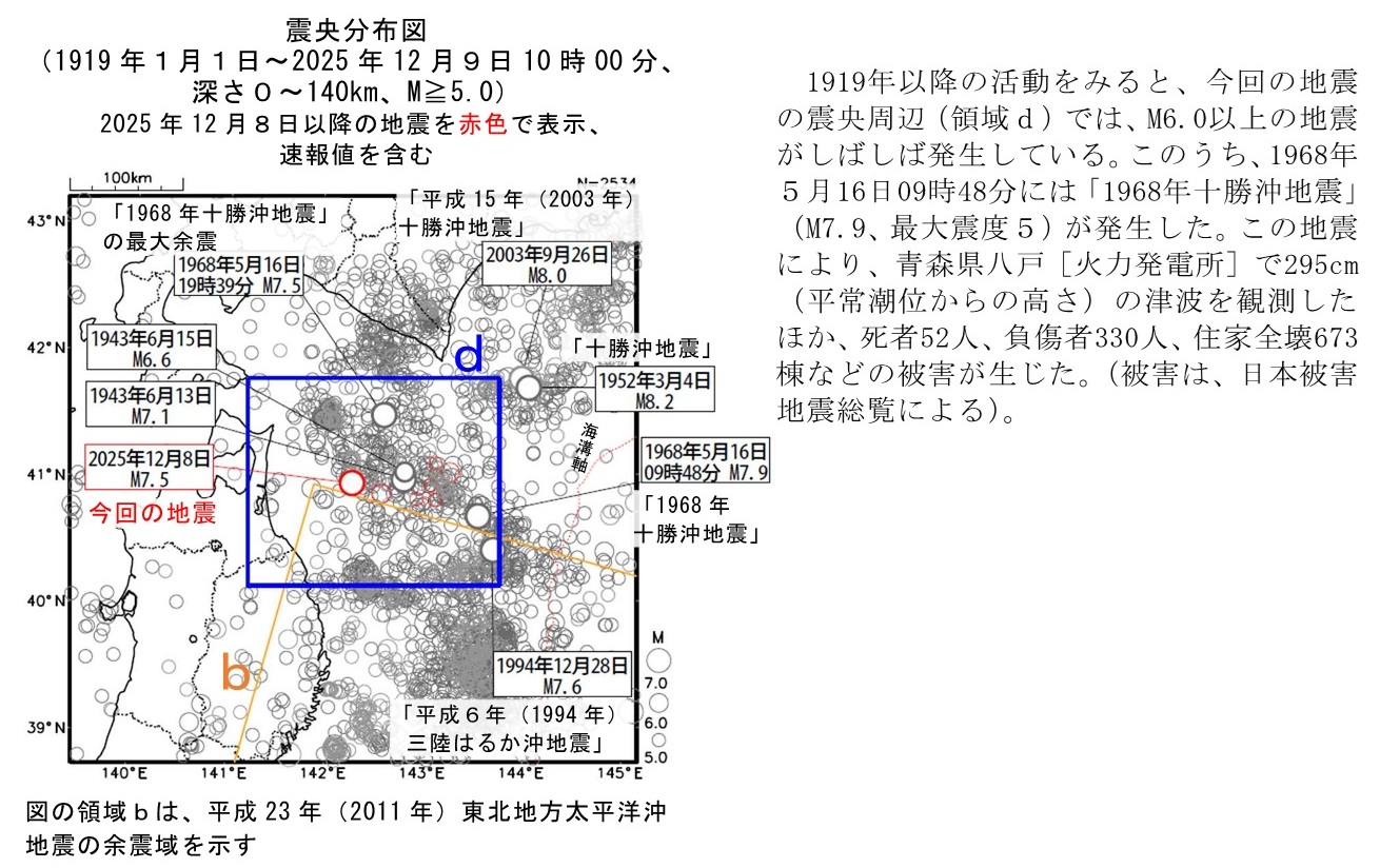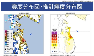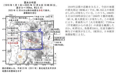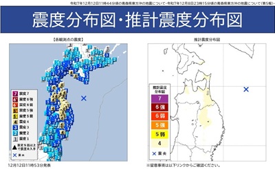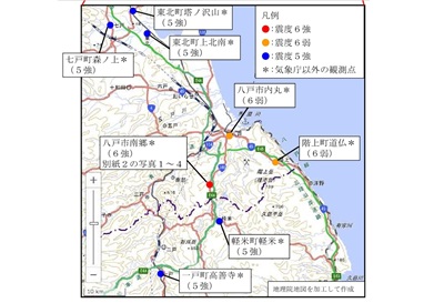 この地震について、京都大防災研究所の西村卓也教授は「1994年の三陸はるか沖地震(M7・6)と規模の似た海溝型地震。震源ははるか沖より北側の下北半島沖合」と指摘した。三陸沖では今年11月9日にもM6・9の地震が起きており、「多少誘発された可能性も考えられる」という。