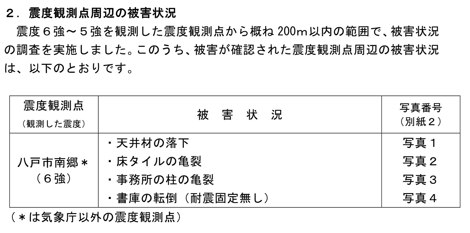 三戸高校では、エキスパンション(建物の揺れを軽減する継ぐ手)が機能して破損し、蛍光灯や食器が破損したということです。 |