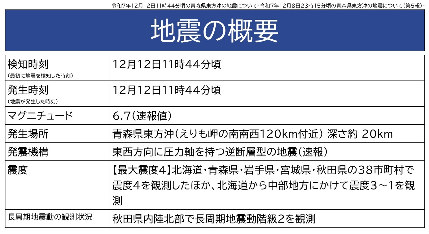 12日午前11時44分頃、北海道、青森県、岩手県、宮城県、秋田県で最大震度4を観測する地震が発生しました。震源地は青森県東方沖(北緯40.9度、東経143.0度)で、震源の深さは約20km、地震の規模(マグニチュード)は6.7と推定されます。