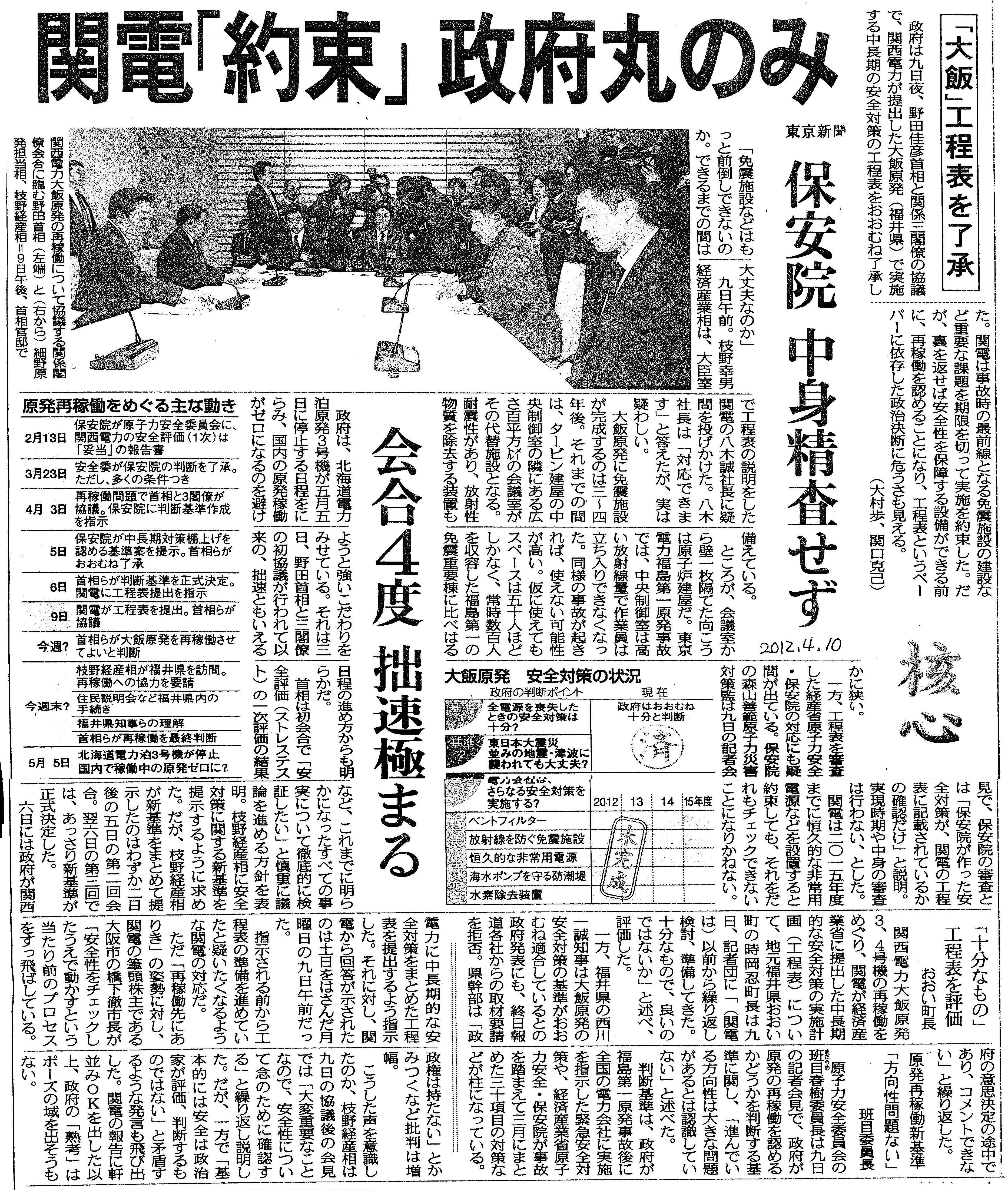 関電「約束」 政府丸のみ 「大飯」工程表を了承 保安院 | 東京新聞 | 2012/04/10 |