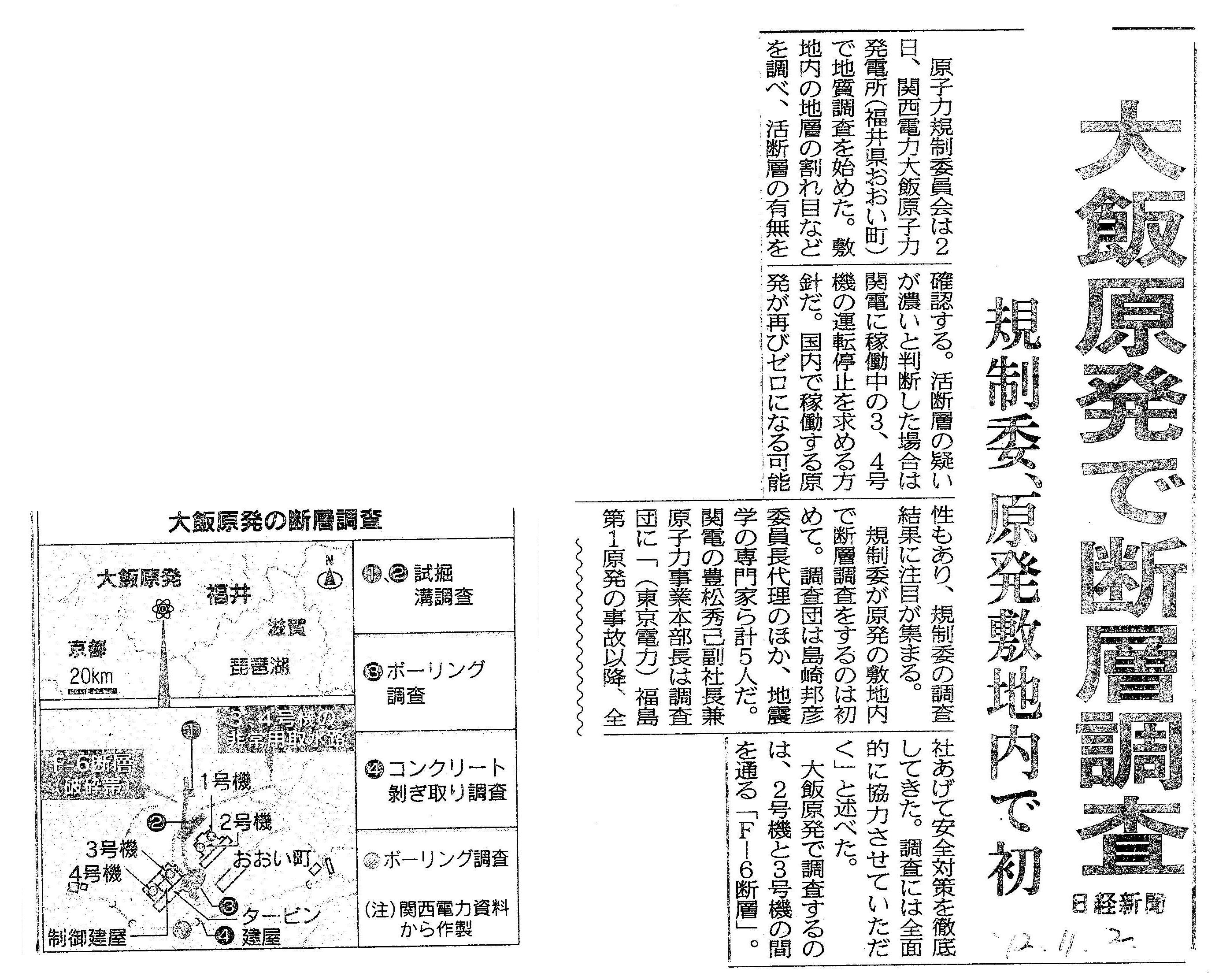 大飯原発で断層調査 規制委、原発敷地内で初 | 日経新聞 | 2012/11/02 |