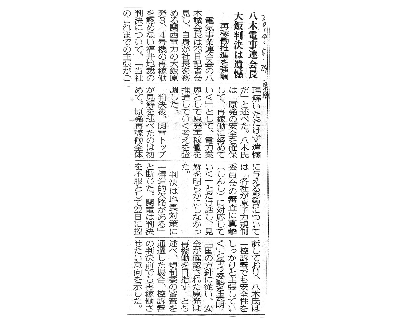 八木電事連会長 大飯判決は遺憾 再稼働推進を強調 | 東奥日報 | 2014/05/24 |
