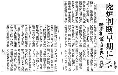 廃炉判断「早期に」 経産相、電力業界へ要請 | 東奥日報 | 2014/10/18 |