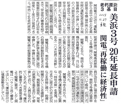 老朽原発3基目 美浜3号 20年延長申請 関電「再稼働に経済性」 | 東奥日報 | 2015/11/27 |