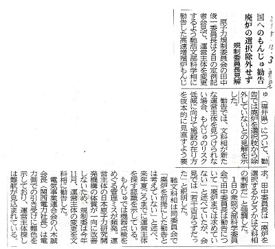 国へのもんじゅ勧告 廃炉の選択除外せず 規制委員長見解 | 東奥日報 | 2015/12/03 |