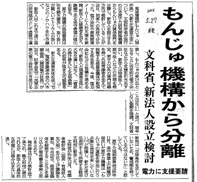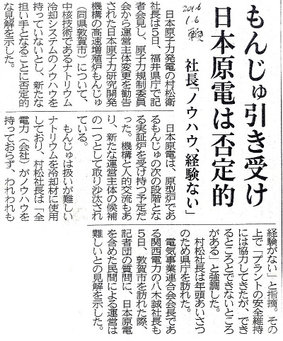 もんじゅ引き受け 日本原電は否定的 社長「ノウハウ、経験ない」 | 東奥日報 | 2016/01/06 |
