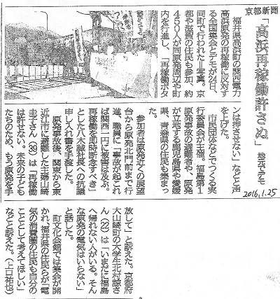「高浜再稼働許さぬ」 地元でデモ | 京都新聞 | 2016/01/25 |