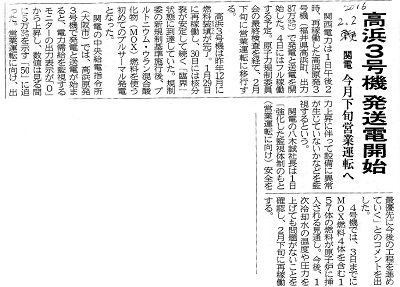 高浜3号機 発送電開始 関電 今月下旬営業運転へ | 東奥日報 | 2016/02/02 |