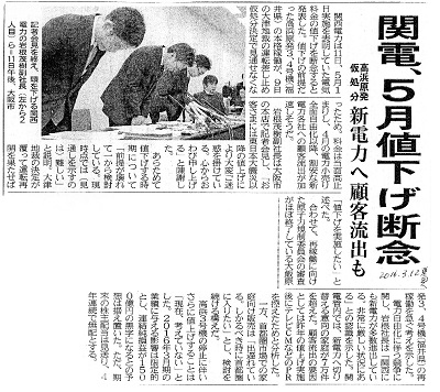 関電、5月値下げ断念 高浜原発仮処分 新電力へ顧客流出も | 東奥日報 | 2016/03/12 |