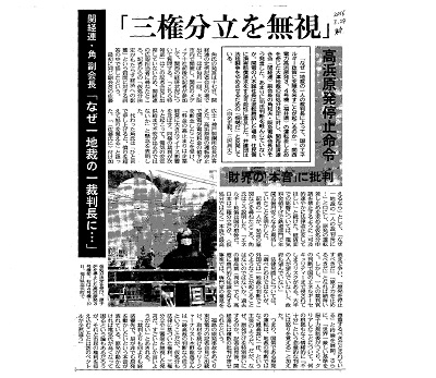 関経連・角 副会長「なぜ一地裁の一裁判長・・・」 | 東京新聞 | 2016/03/24 |