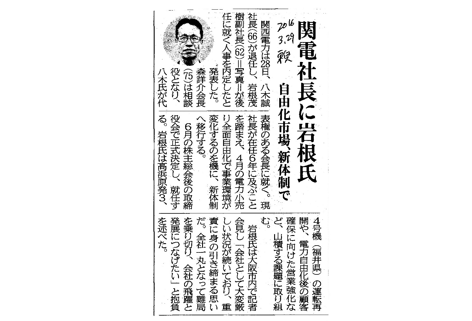 電事連会長に関西電力の岩根氏 6月、自由化や原発対応 | 共同通信 | 2019/03/21 |