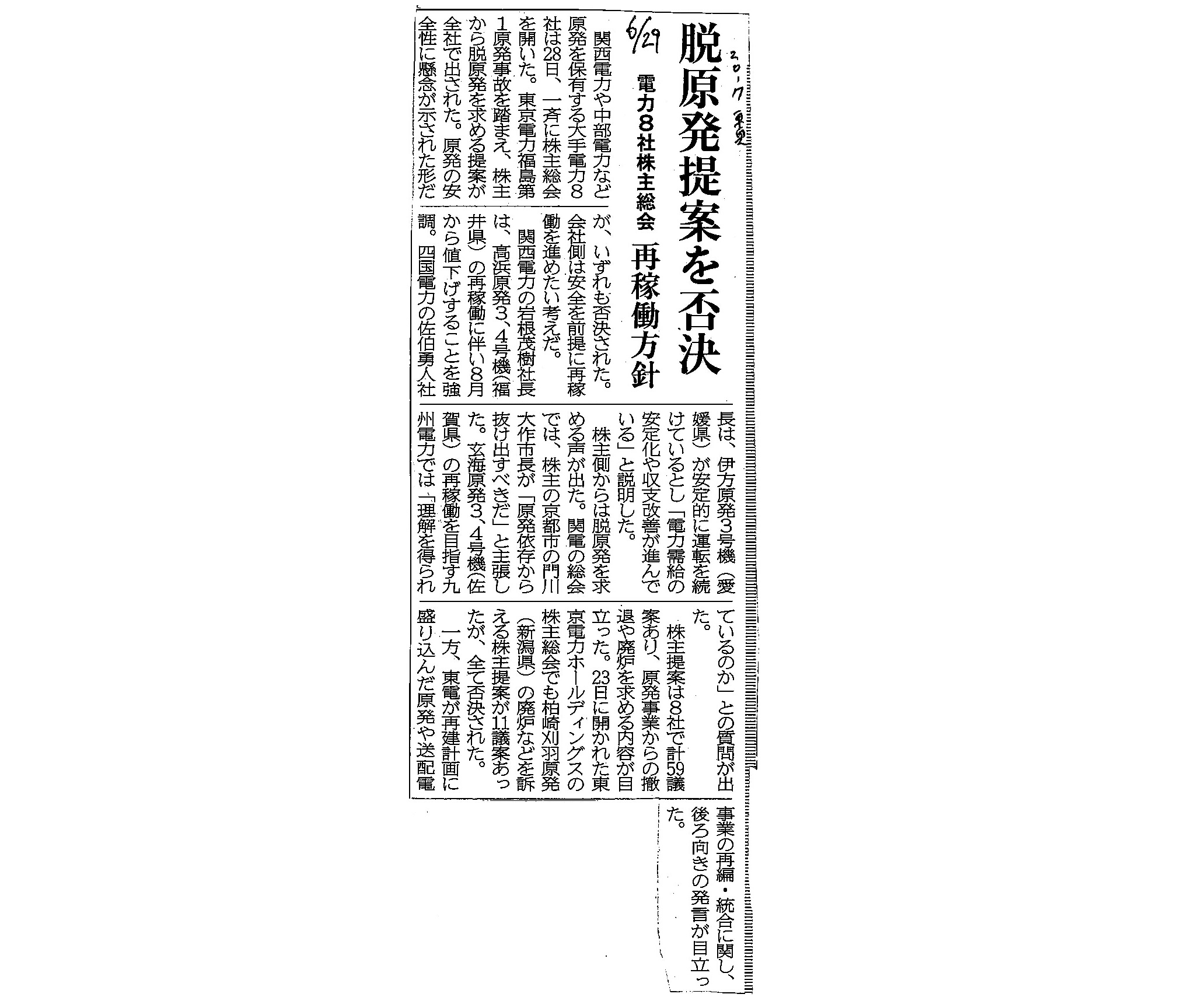 脱原発提案を否決 電力8社株主総会 再稼働方針 | 東奥日報 | 2017/06/29 |