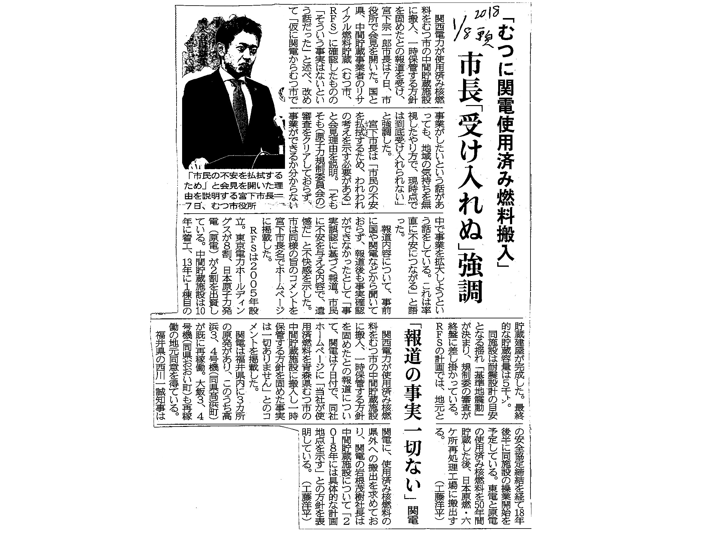 使用済み燃料搬入 市長「受け入れぬ」強調 「報道の事実一切ない」関電 | 東奥日報 | 2018/01/08 |