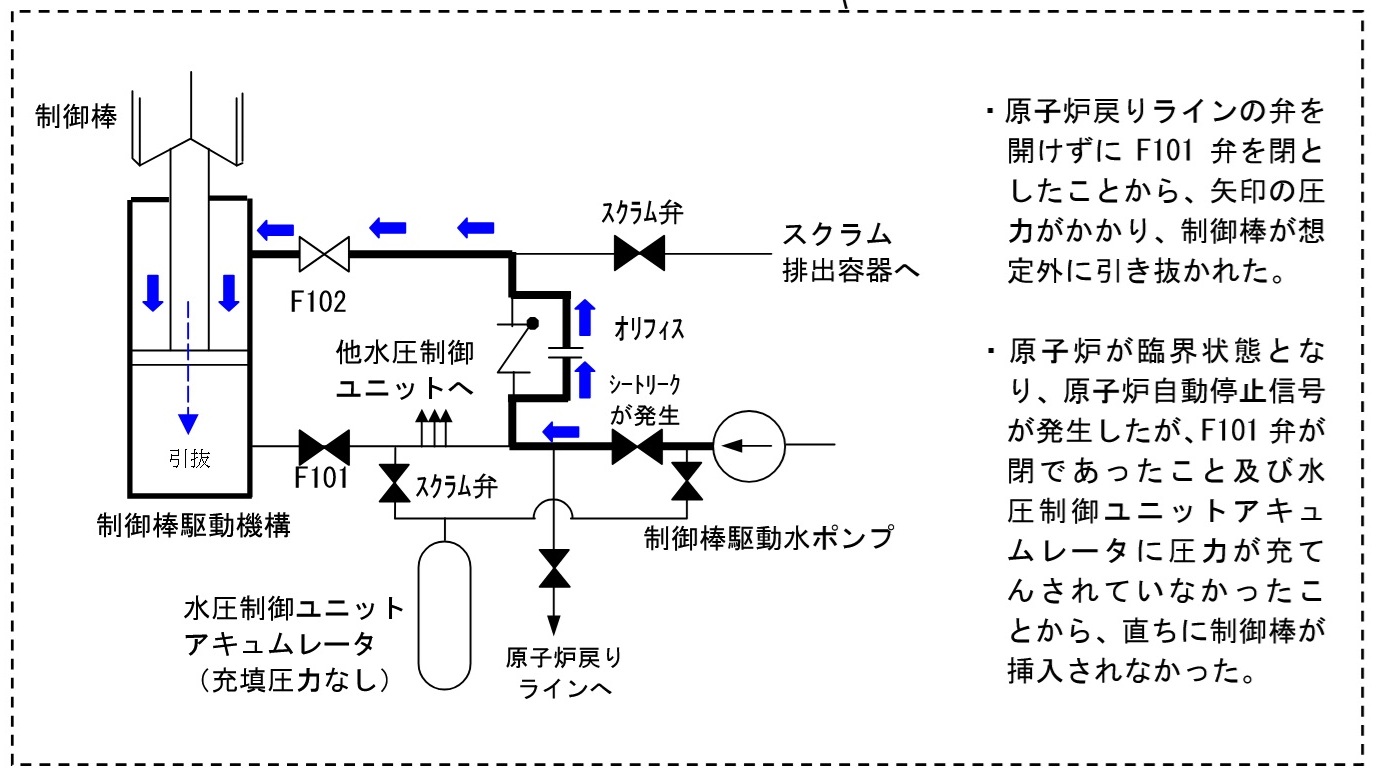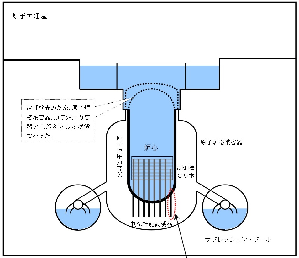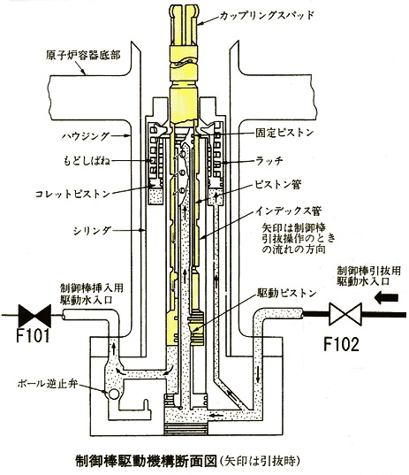04:00 1. はじめに 志賀原発で1999年6月に臨界事故が発生していたことが発覚した。その後、東京・東北・中部電力の沸騰水型原子炉(BWR)で臨界には至らなかったとしても同様な制御棒引抜事故が発生していたこと、発生しても報告も情報交換すら行われていなかったことが明らかになった。 さらに22日には、福島第一原発3号機で1978年に5本の制御棒が抜け落ち、7時間30分の長時間にわたって臨界が継続していた事故が発覚した。東電は約30年間も隠ぺいし続けていた。さらに、79年には福島第一原発5号機で、80年には同2号機で、定期検査中に制御棒1本が抜ける事故が起きていた。電力各社は、これら全てを隠ぺいし続けてきた。北陸電力の取締役が隠ぺいを知っていた事実も明らかになった。まだまだ重大な事故などが隠ぺいされているに違いない。 電力会社や原子力安全・保安院は、制御棒を操作する際の手順書が誤っていたとか、手順書通りに操作されなかったことが問題であるとしている。しかし、ここではBWR特有の構造問題から出発し、定期検査ごとに行われる制御棒挿入用配管側の手動弁を閉めた作業条件下では、現在の制御棒駆動装置が極めて不安定な挙動をせざるを得ない特質を持っていること、反応度事故に備えた制御棒緊急挿入が出来ないこと、すなわち、構造的な欠陥のあることを明らかにする。このような構造的欠陥をもつBWRは直ちに停止すべきである。 2. 余儀なくされた原子炉容器下部からの制御棒挿入 原子炉内で直接蒸気を発生させるBWRでは、その水蒸気から水気を取り除くための大きな湿分分離器が炉心上部に置かれている。そのため、制御棒は下側から炉心に挿入されている。したがって重力が制御棒を原子炉から抜こうとする方向に作用し、それを防止するための技術的対策が必要である。自動車のアクセルやブレーキに相当する制御棒は、ただ固定しておくのでは用をなさず、炉心内を正確に上下運動し原子炉出力を粗・微調整できなければならない。 このような制御棒調整をする機構として、原子炉圧力容器外部から何らかのシール部を介して操作用の棒を差し込み、それで制御棒を動かすことがまずは考えられるかもしれない。ところが、運転中のBWR原子炉圧力は65気圧、原子炉温度は300℃に及ぶため、シール部からの冷却水漏れを防ぐことは実際上不可能である。また、制御棒が完全に抜けて、シール部が破損するような事態になれば、反応度事故と冷却水喪失事故とが同時に発生してしまう。それゆえ、そのような構造は安全上避けるべきであるということになる。 そこで、臨界事故を起こした志賀原発も含めて、BWRでは「水圧ロッキングピストン式制御棒駆動機構」とよばれる機構が採用されている(図1参照)。 ![]() 図1 水圧ロッキングピストン式制御棒駆動機構(『原子力発電便覧』より) F101弁とF102弁を加筆した。 3. 原子炉圧力65気圧を前提に設計 同機構は原子炉圧力容器と一体となっているので、制御棒に接続する可動部で高圧水をシールする必要はない。駆動部を原子炉の中に入れてしまったからである。原子炉の底に穴が開くことに気を使った構造とも言えるが、逆に制御棒の動きや位置を制御するのに自動車のハンドルのような歯車やネジを使った機構を用いて行うことはできなくなった。実際、制御棒は水圧ピストンにつながっており、そのピストンの上面と下面とに作用させる水圧で動く。たとえれば、たらいに浮かべたおもちゃの船を動かすのに、船を手で押すのを禁じられたために、ふちから手で水流を起こして動かすようなものである。機械を使った機構による操作と比較するとどうしても不安定になる。 ![]() 図2 臨界事故時の原子炉1(北陸電力公表資料) 制御棒を上下に動作させるために、同機構下部には、ピストンを押し上げる制御棒挿入用駆動水入口(図1中で左F101弁に接続)と、ピストンを下げる制御棒引抜用駆動水入口(図1中で右F102弁に接続)との2つの入口が設けられている。さらに、原子炉圧力に負けない高圧水をそれらの入口から送り込むことのできる制御棒駆動系水圧ユニットがそれに接続している。すなわち制御棒駆動水の圧力は原子炉圧力と同程度に維持されており、それができなければここを通じて冷却水が抜け出してしまう安全上重要な部位である(制御棒駆動機構内の水は原子炉容器内の水と隙間を通じて連携しており、したがって両者の圧力も連携している)。制御棒を緊急挿入しなければならない時には、窒素ガスで予め加圧しておいた水を、スクラム弁を介して制御棒挿入用駆動水入口側(F101弁側)から注入し、制御棒を緊急挿入することになっている(水圧制御ユニットアキュムレータと呼ばれる)。また、注入圧力が足らなくなるような事態になると、原子炉水が入り込んで制御棒の引抜きを防止する構造(図1のボール逆止弁)であるとされていた。それにもかかわらず志賀原発では3本もの制御棒が抜けてしまい臨界事故に至った。原子炉自動停止にも