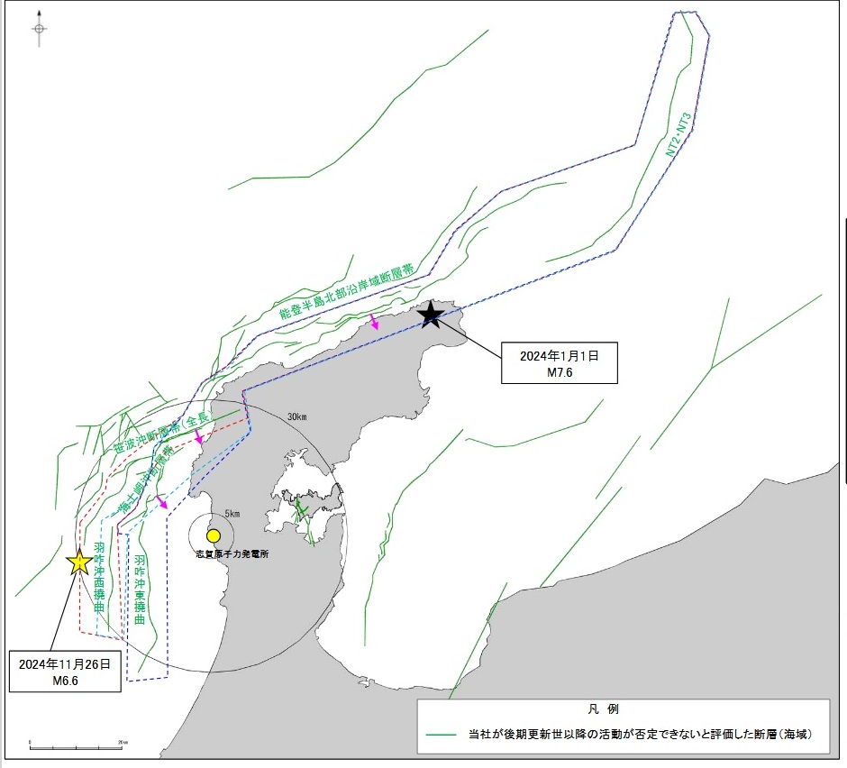 13:30 はじめに ○当社は,第1328回審査会合(2025年3月21日)において,2024年1月1日に発生した令和6年能登半島地震(M7.6)及び2024年11月26日に発生した石川県西方沖の地震(M6.6)の知見を踏まえた敷地周辺(海域)の断層の評価について説明を行い,以下@〜Cの4項目に関するコメントを受けた。 @ 石川県西方沖の地震(M6.6)の震源断層(コメントNo.81) A 石川県西方沖の地震(M6.6)の震源断層との連動(コメントNo.82) B 能登半島北部沿岸域断層帯等の傾斜角の評価(コメントNo.83) C 連動評価フローにおける表現の適正化(コメントNo.84) ○本日は,上記コメントのうち,@及びAについて第1328回審査会合以降に確認した知見を踏まえて,回答を行う。Bについては,その他の敷地周辺(海域)の断層の評価も含めて次回以降回答予定。Cについては,第1371回審査会合(2025年11月21日)で回答済。 ○また,第1371回審査会合(2025年11月21日)で説明を行った「敷地周辺(陸域)の断層の評価」において,陸域の断層に関するコメントのほか,一部海域の断層にも関連するD敷地周辺断層の評価の流れ(コメントNo.85)についてのコメントを受けたことから,このコメントへの回答も行う。 ○ なお,当資料の冒頭(P.8〜22)において,今回とりまとめた資料の概要を以下の項目ごとに整理した。 T.令和6年能登半島地震の概要 U.令和6年能登半島地震に関連する知見の収集状況 V.コメント回答の概要※ W.敷地周辺断層の評価の流れ X.敷地周辺断層の評価結果(まとめ) ※:今回連動を考慮した 「笹波沖断層帯(全長)と羽咋沖西撓曲」と同様に,傾斜方向が異なる断層が一部並走区間を伴って近接して分布する関係にある「海士岬沖断層帯と羽咋沖東撓曲」の連動評価についても,改めて検討を実施。 【本日の説明内容】 ![]() ・@ 石川県西方沖の地震(M6.6)の震源断層 (コメントNo.81)(図中 ☆ ) ・A 石川県西方沖の地震(M6.6)の震源断層との連動 (コメントNo.82)(図中 赤・青・緑色点線の四角枠) ・D 敷地周辺断層の評価の流れ (コメントNo.85) 【次回以降説明予定】 ・B 能登半島北部沿岸域断層帯等の傾斜角の評価 (コメントNo.83)(図中 赤色右下向き矢印) 【説明済(第1371回審査会合(2025年11月21日))】 ・C 連動評価フローにおける表現の適正化 (コメントNo.84 原発30km圏内の拡大図(※引用者作成) ![]() (後略) |