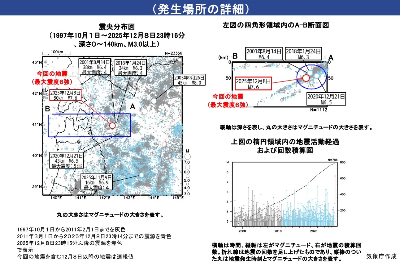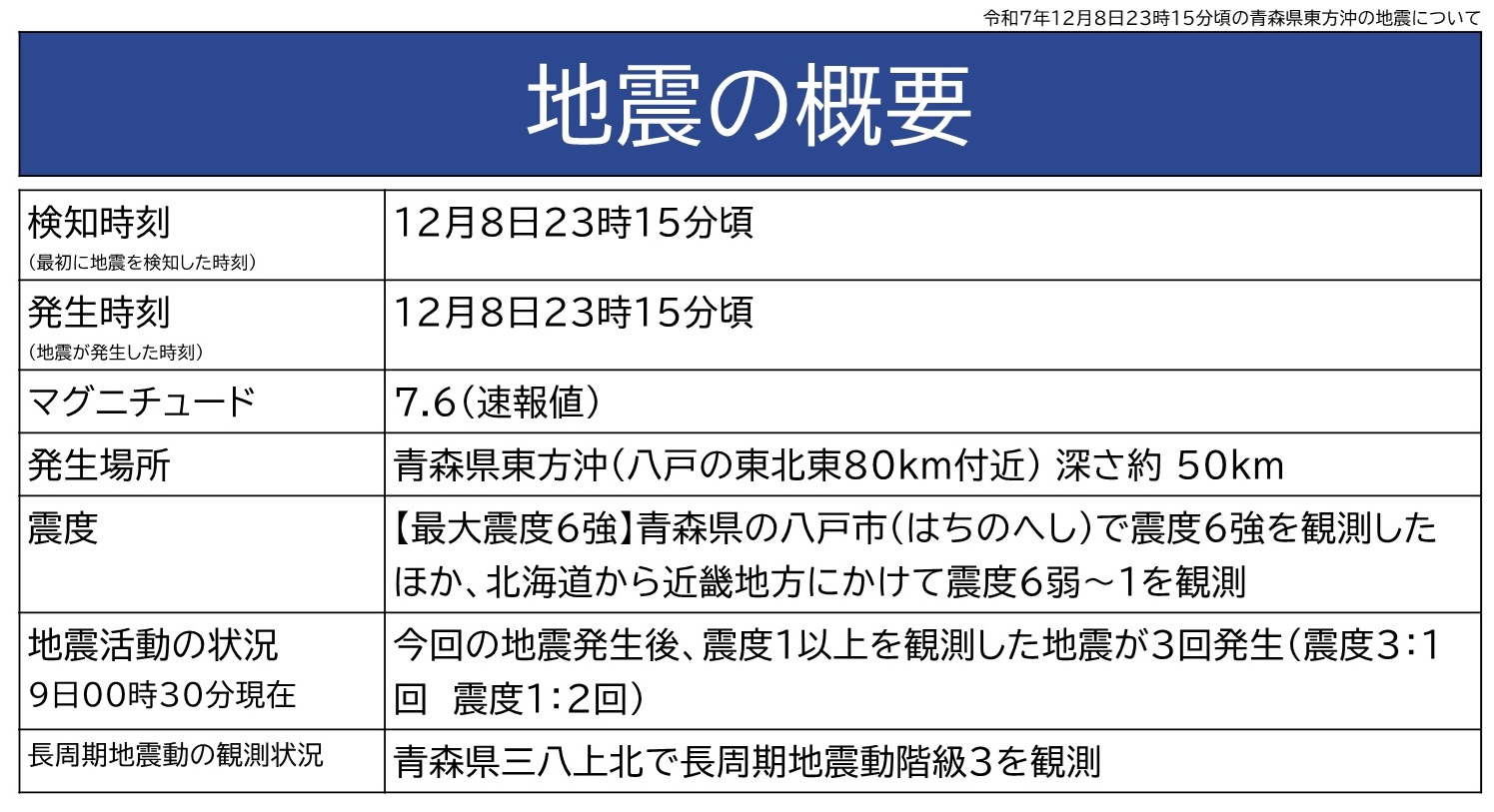 8日午後11時15分ごろ、青森県沖を震源とする震度6強の地震があり、気象庁は9日午前2時、日本海溝・千島海溝沿いで大規模地震の発生可能性が平常時より相対的に高まったとして「北海道・三陸沖後発地震注意情報」を発表した。発表は、2022年12月の制度運用開始後初めて。