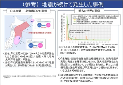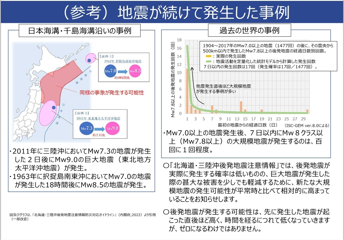 静岡大の石川有三客員教授(地震学)は「今回の地震は2003年の十勝沖地震と1994年の三陸はるか沖地震の震源域の間が震源になっているとみられる。二つの地震でプレートが破壊されなかった『空白域』に割れ残りがあり、今回の地震に至った可能性がある。まだ割れ残りがある場合は、時間をおかずにまた地震が発生する可能性がある」と話した。