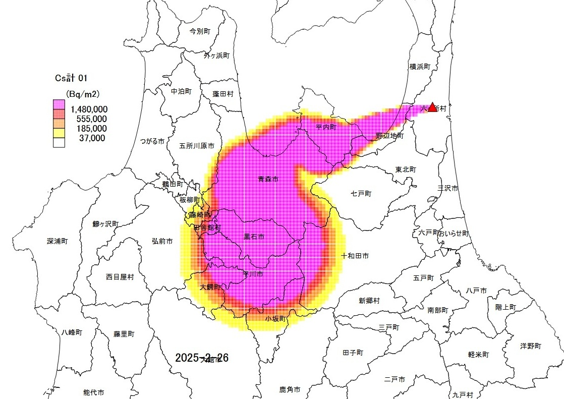 六ヶ所再処理施設の危険性が現実化したというべきだ。 再処理施設で事故が発生した場合に、施設のどの部分が破損し、どのような核種がどのくらい放出されるかについてはさまざまなシナリオが考えられ、影響の評価(被ばく量など)も各種提案されている。 ここでは貯留されている濃縮廃液の10%が放出されると仮定する。(※1) 当面、ある気象条件でシミュレーションした結果を図に示す。 ◎ 日本の被ばく基準は甘いが、参考としてチェルノブイリ基準を適用した場合、図の紫は強制移住ゾーンである。 青森県の広範囲にわたって居住不能の範囲が発生する。 |